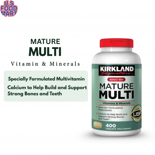 Support healthy aging with Kirkland Signature Mature Multi Adult 50+ — a complete daily multivitamin and mineral formula designed to maintain energy, bone strength, heart health, and overall wellness for adults over 50.Kirkland Signature Mature Multi Adult 50+ Vitamins & Minerals 400 Tablets provide a comprehensive blend of essential vitamins and minerals tailored for adults aged 50 and above. This formula helps support heart and bone health, cognitive function, immune system strength, and overall vitality. With 400 convenient tablets, it ensures long-term daily nutritional support for healthy aging.
