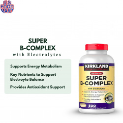 Kirkland Signature Super B-Complex with Electrolytes 500 Tablets provide a powerful combination of eight essential B vitamins plus vital electrolytes to help your body convert food into energy efficiently. This balanced formula supports the nervous system, promotes healthy metabolism, and helps maintain hydration and muscle function — making it ideal for active individuals and daily wellness.